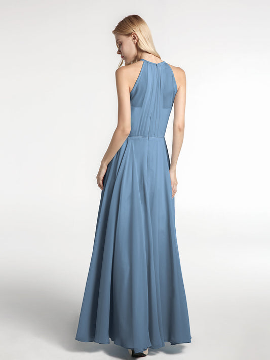 Vestidos largos de dama de honor de chiffon con tirantes de cuello halter Azul Pizarra
