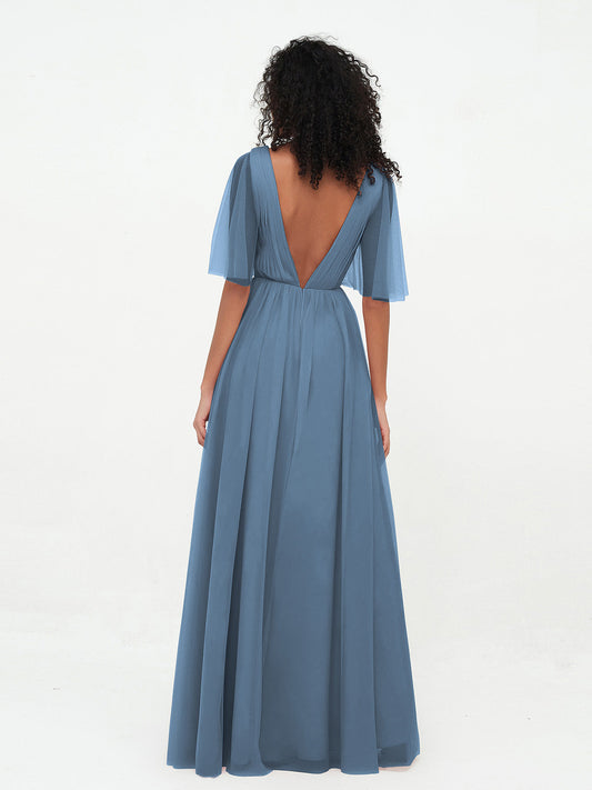 Babaroni KatherineVestidos máximos de tul estilo A-line con escote en V profundo en la espalda Azul Pizarra