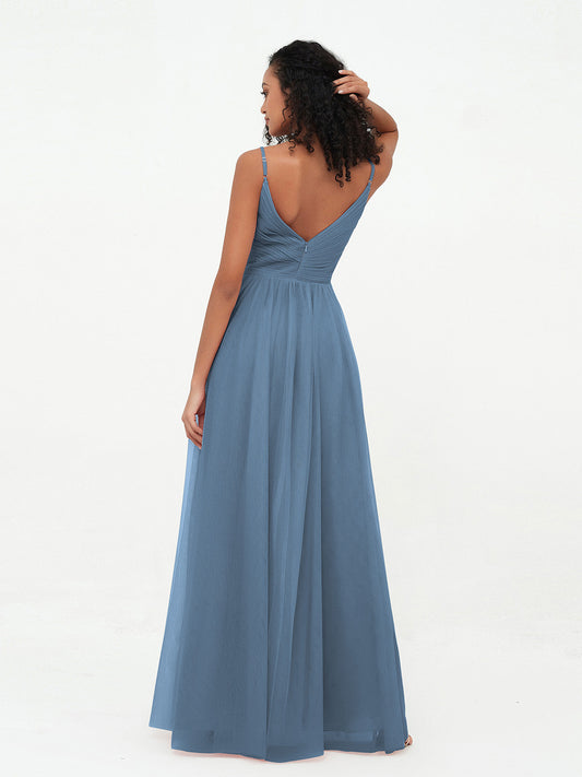 Babaroni MarjorieVestidos largos de tul plisado con tirantes spaghetti Azul Pizarra