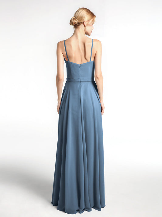 Babaroni MaudSencillos vestidos largos de chiffon con tirantes finos y abertura Azul Pizarra