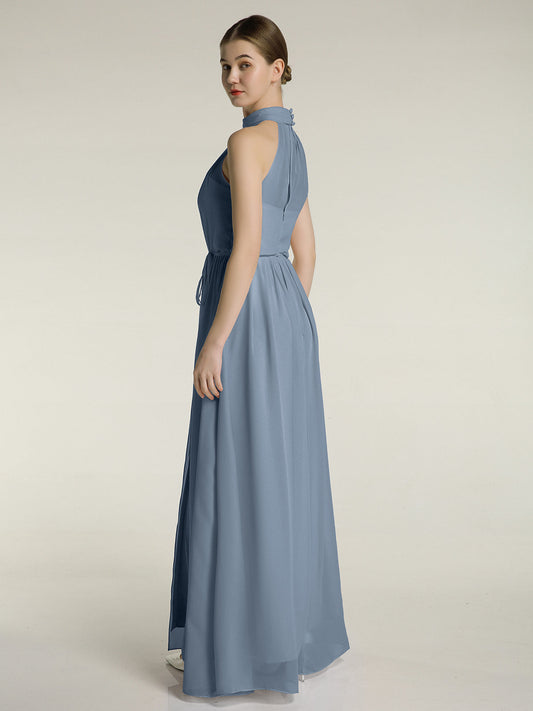 Babaroni KimiVestidos de chiffon de cuello alto con abertura y lazo de cinturón Azul Polvoriento