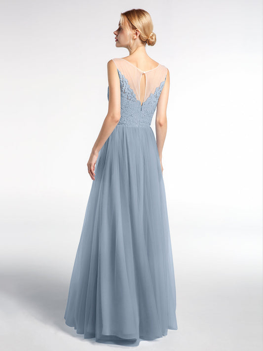 Babaroni PamelaVestido maxi de encaje y tul con escote ilusión Azul Polvoriento