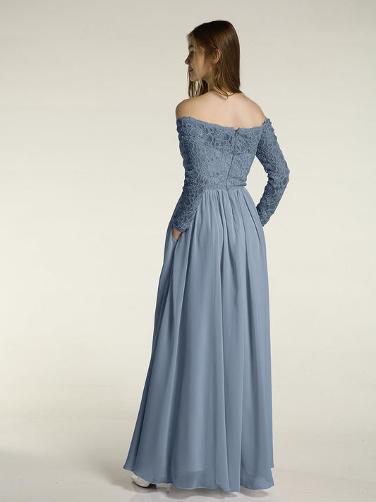 Babaroni MeilaniVestidos de encaje y chiffon con mangas largas y bolsillos Azul Polvoriento