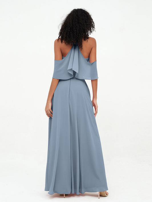 Vestidos máximos de chiffon estilo halter con hombros descubiertos Azul Polvoriento