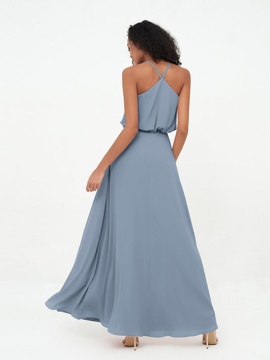 Vestidos largos de chiffon estilo halter con espalda descubierta Azul Polvoriento