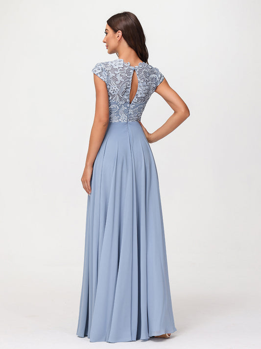 Babaroni SherryVestido maxi de encaje y chiffon con mangas cortas Azul Polvoriento