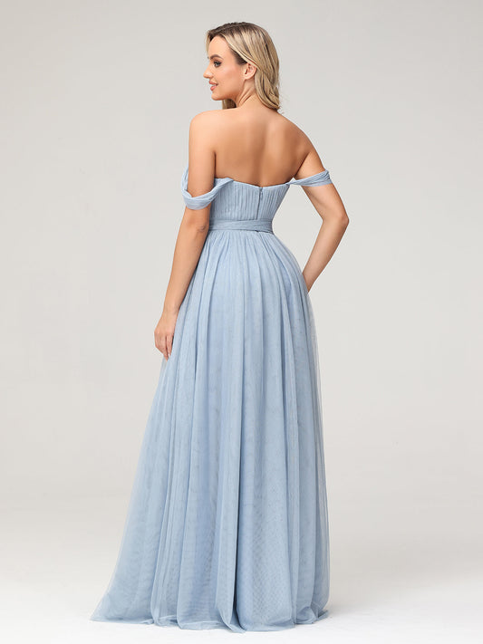 Babaroni GustaveVestidos de tul estilo princesa de hombros descubiertos con lazo en la cintura Azul Polvoriento