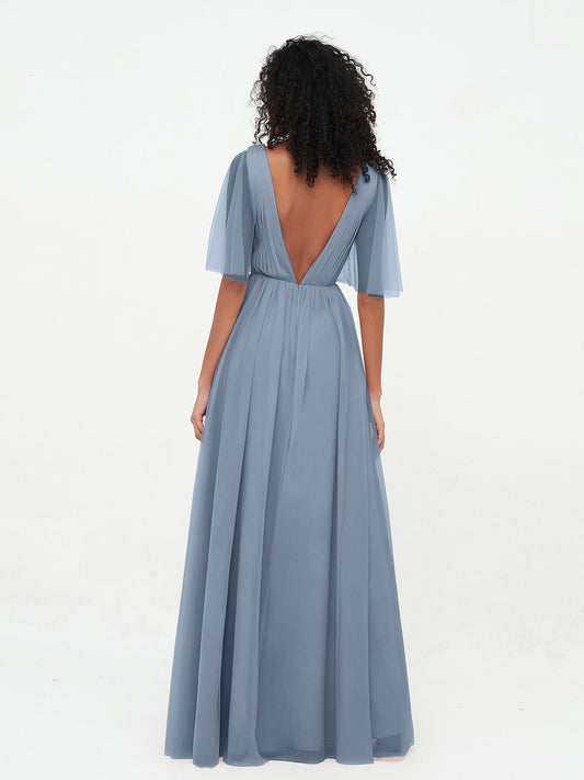 Babaroni KatherineVestidos máximos de tul estilo A-line con escote en V profundo en la espalda Azul Polvoriento