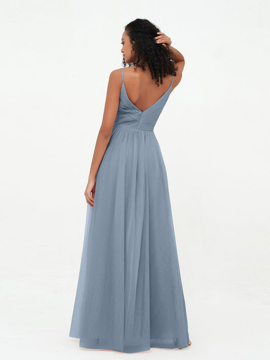Babaroni MarjorieVestidos largos de tul plisado con tirantes spaghetti Azul Polvoriento