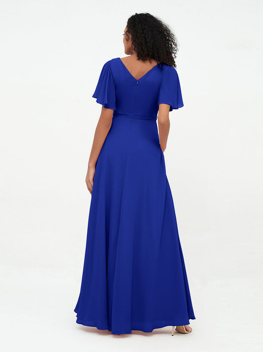 Babaroni YvetteVestidos máximos de chiffon con mangas de volantes y lazo en la cintura Azul Royal
