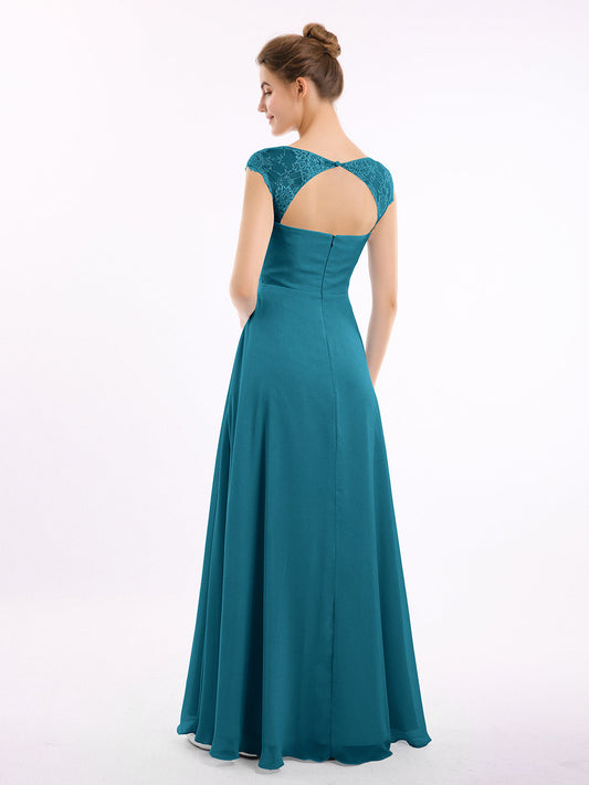 Vestidos de dama de honor de chiffon con mangas cap de encaje Azul tinta