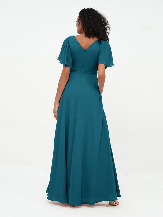 Babaroni YvetteVestidos máximos de chiffon con mangas de volantes y lazo en la cintura Azul tinta