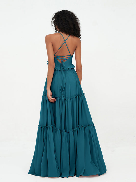 Babaroni UrsulaVestidos máximos bohemios de chiffon con falda escalonada estilo Empire Azul tinta