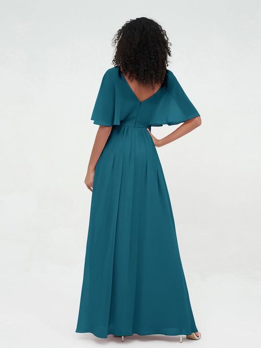 Babaroni MignonVestidos largos de dama de honor de chiffon con mangas de volantes Azul tinta