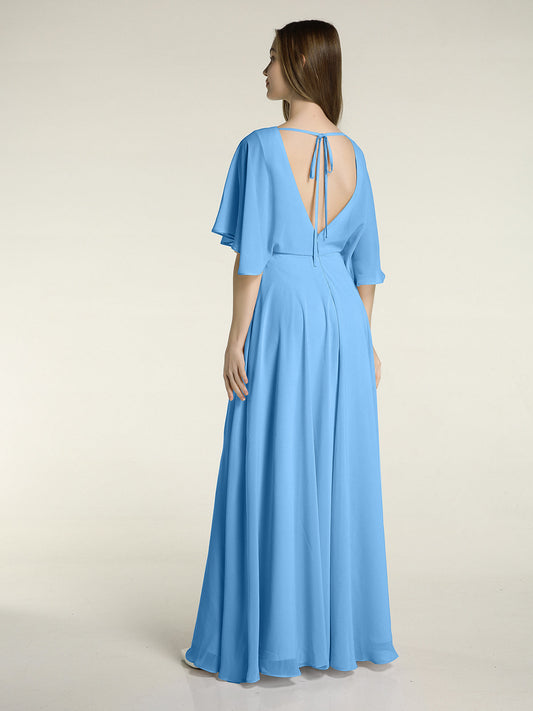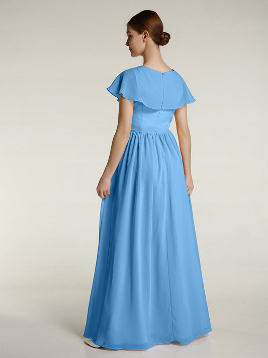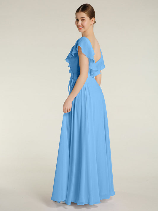 Babaroni MignonVestidos largos de dama de honor de chiffon con mangas de volantes Azul