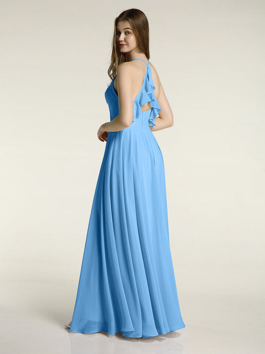 Vestidos largos de dama de honor de chiffon con tirantes de cuello halter Azul