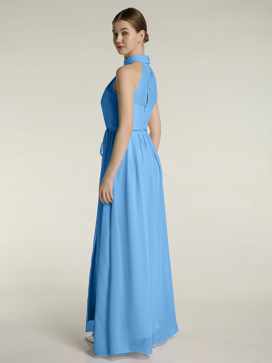 Babaroni KimiVestidos de chiffon de cuello alto con abertura y lazo de cinturón Azul