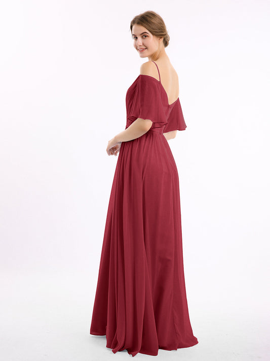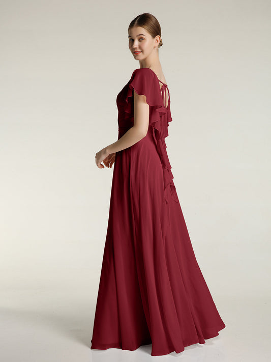 Babaroni RosaVestidos largos de dama de honor de chiffon con escote en Y y mangas de volantes Borgoña