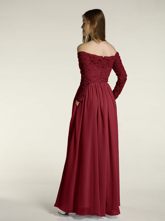 Babaroni MeilaniVestidos de encaje y chiffon con mangas largas y bolsillos Borgoña