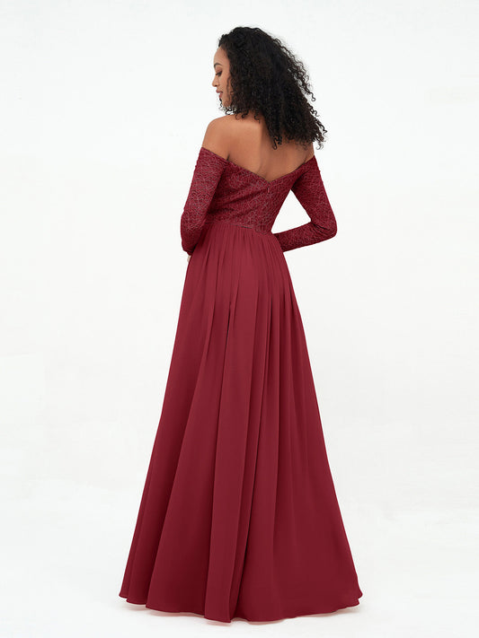 Babaroni JoannaVestidos largos de encaje con mangas largas y hombros descubiertos Borgoña