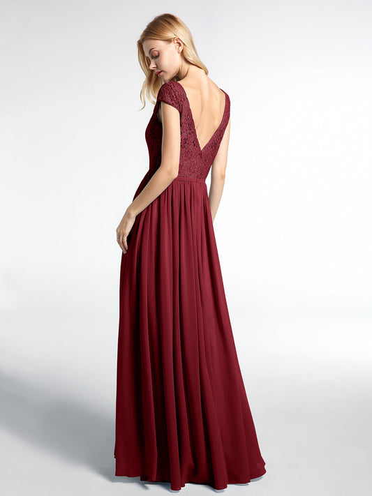 Babaroni SherryVestido maxi de encaje y chiffon con mangas cortas Borgoña