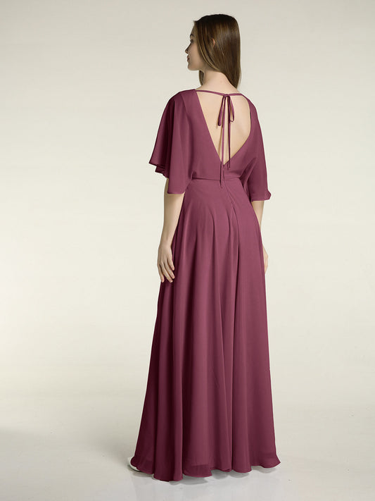 Babaroni RosaVestidos largos de dama de honor de chiffon con escote en Y y mangas de volantes Morado