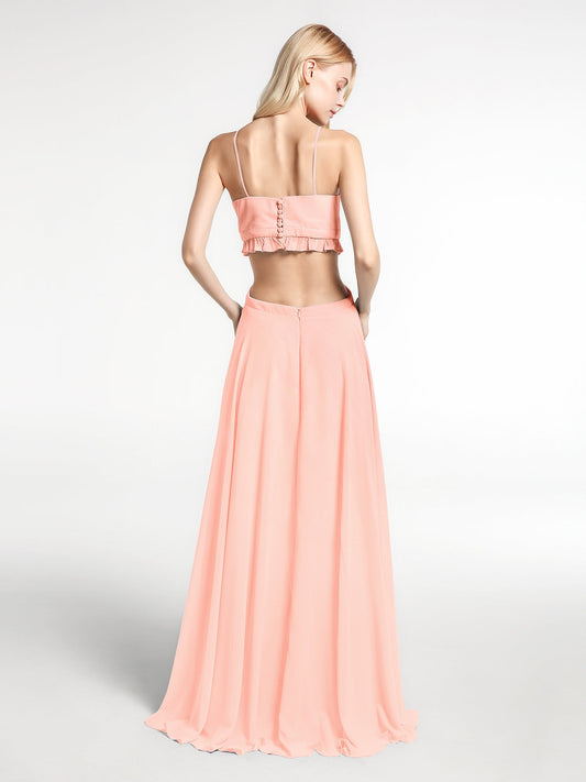 Babaroni EudoraVestido sexy maxi de chiffon con tirantes finos y detalles de volantes recortados Coral