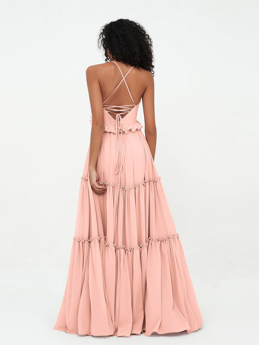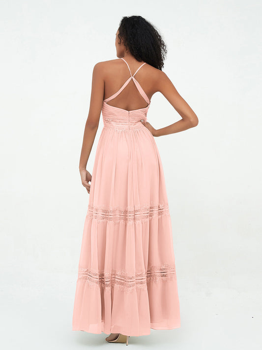 Babaroni AmyVestidos largos de dama de honor de chiffon con tirantes de cuello halter Coral