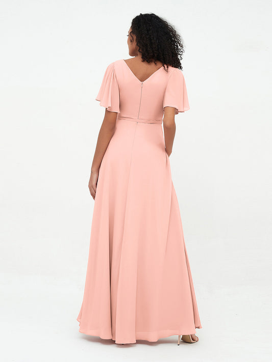 Babaroni UnaVestidos máximos de chiffon con escote en V profundo y mangas 1/2 Coral