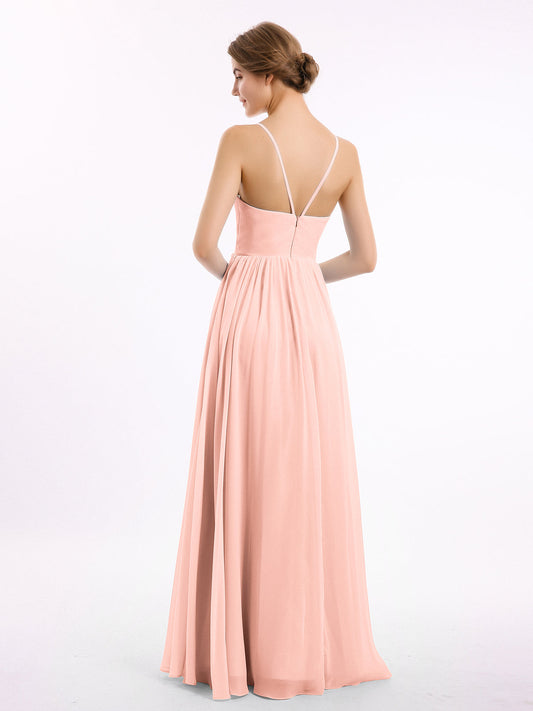 Vestidos de dama de honor de chiffon con tirantes finos y escote en V Coral