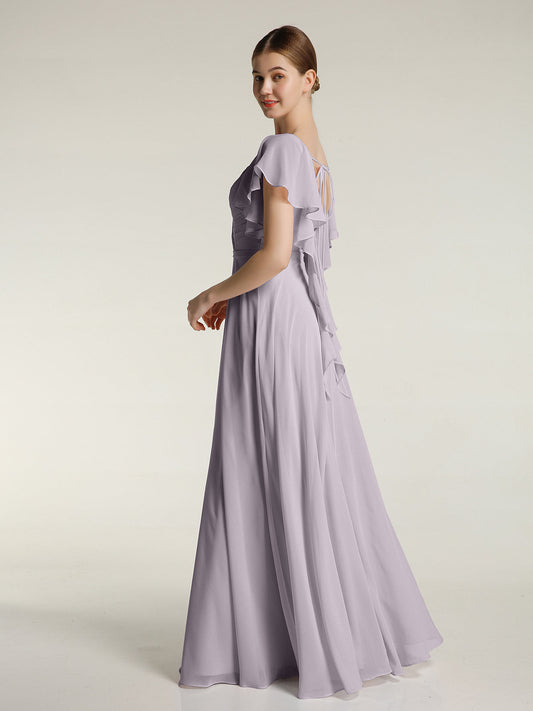 Babaroni RosaVestidos largos de dama de honor de chiffon con escote en Y y mangas de volantes Crepúsculo