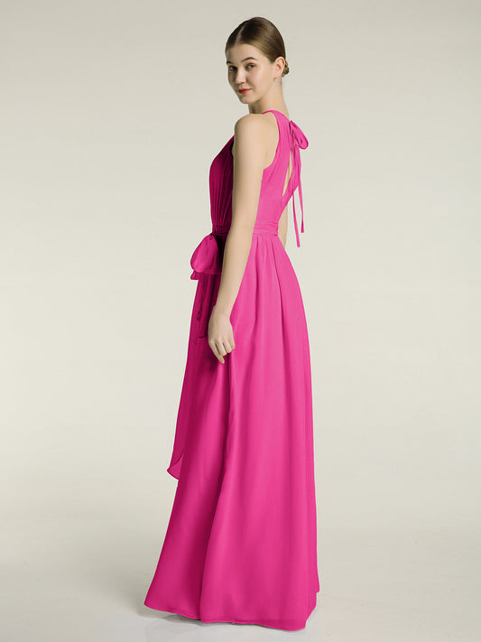 Babaroni JaneVestidos largos de chiffon estilo halter con lazo Fucsia