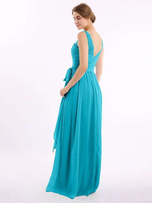 Babaroni LindaVestidos largos de chiffon con tirantes de encaje y lazo de cinturón Jade
