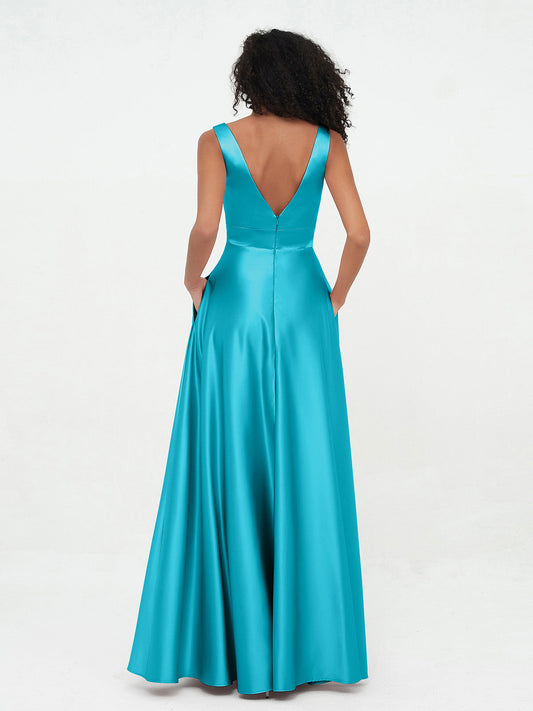 Babaroni SadeVestidos máximos de satén estilo princesa con escote en V y bolsillos Jade