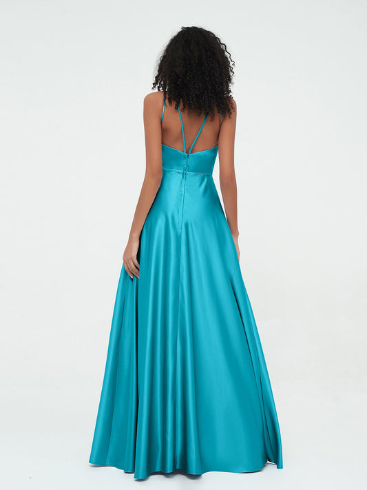 Babaroni RivaVestidos largos de satén con tirantes spaghetti y cuerpo plisado Jade