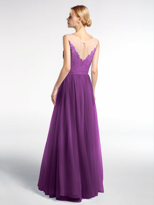 Babaroni PamelaVestido maxi de encaje y tul con escote ilusión Uva