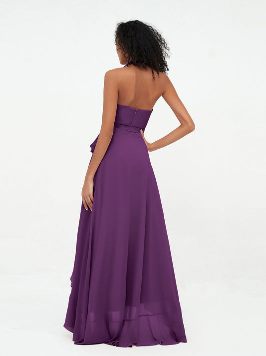 Babaroni VenusVestidos asimétricos de chiffon con cuello halter y escote en V profundo Uva