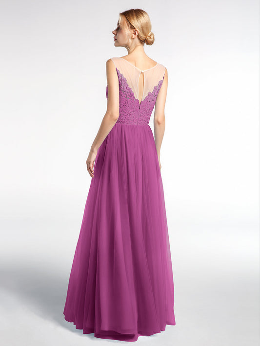 Babaroni PamelaVestido maxi de encaje y tul con escote ilusión Orquídea