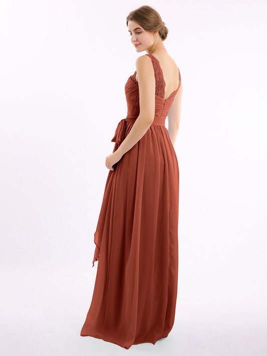Babaroni LindaVestidos largos de chiffon con tirantes de encaje y lazo de cinturón Óxido