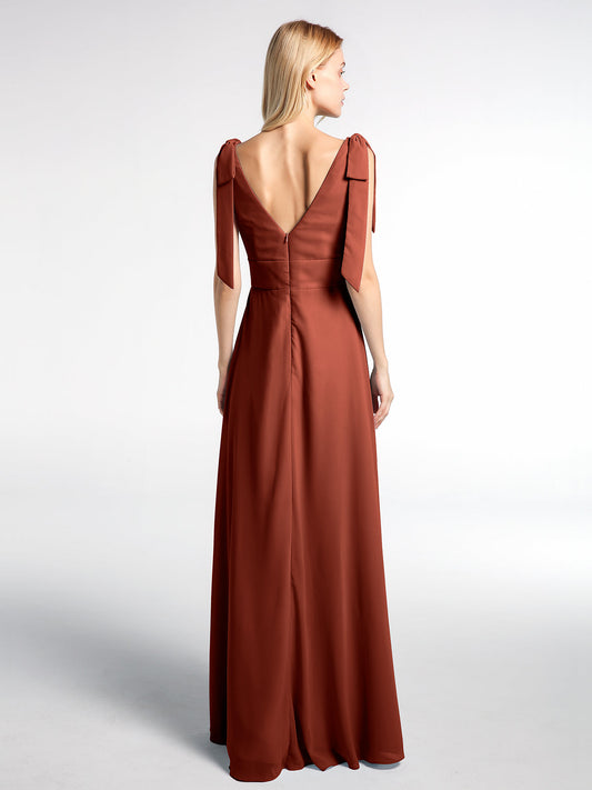 Babaroni IrmaVestido maxi de chiffon con tirantes planos y lazo con abertura frontal Óxido