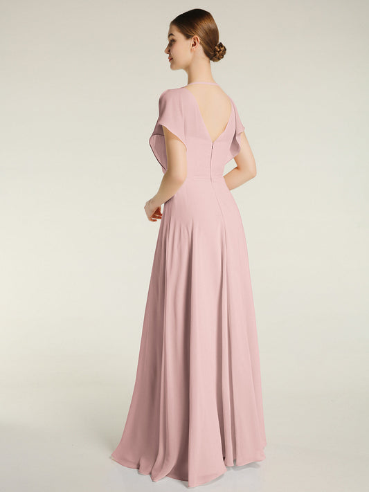 Babaroni SibylVestido largo de chiffon sencillo con escote en forma de muesca Rosa Polvoriento