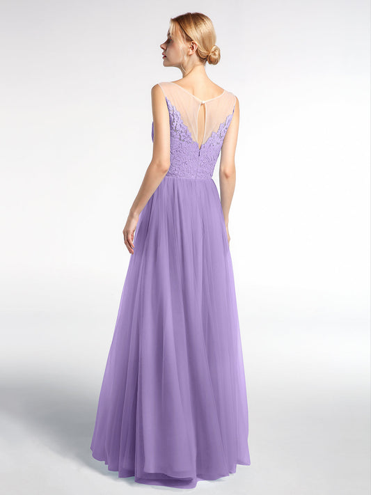Babaroni PamelaVestido maxi de encaje y tul con escote ilusión Tahití