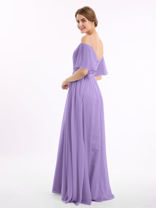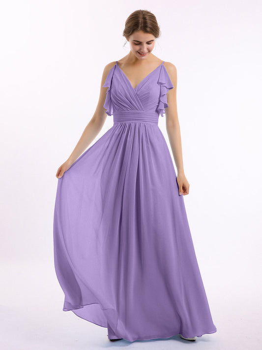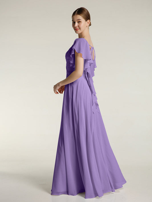 Babaroni RosaVestidos largos de dama de honor de chiffon con escote en Y y mangas de volantes Tahití
