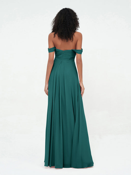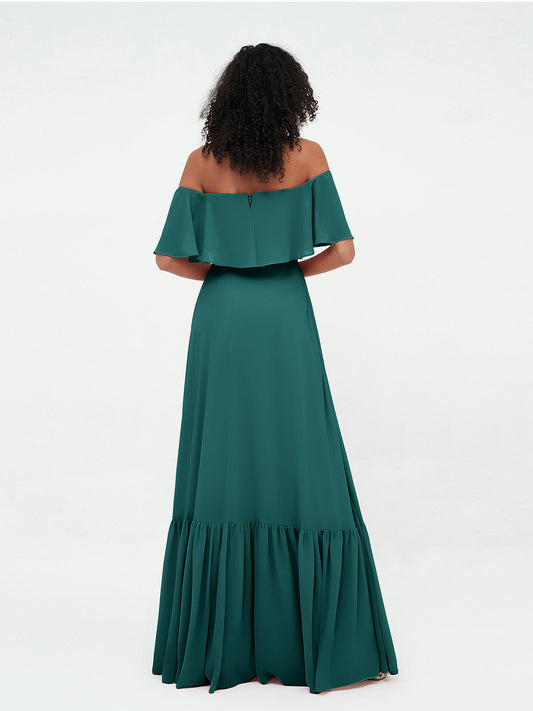 Babaroni VirginiaVestidos máximos de chiffon con falda escalonada estilo off shoulder Pavo real