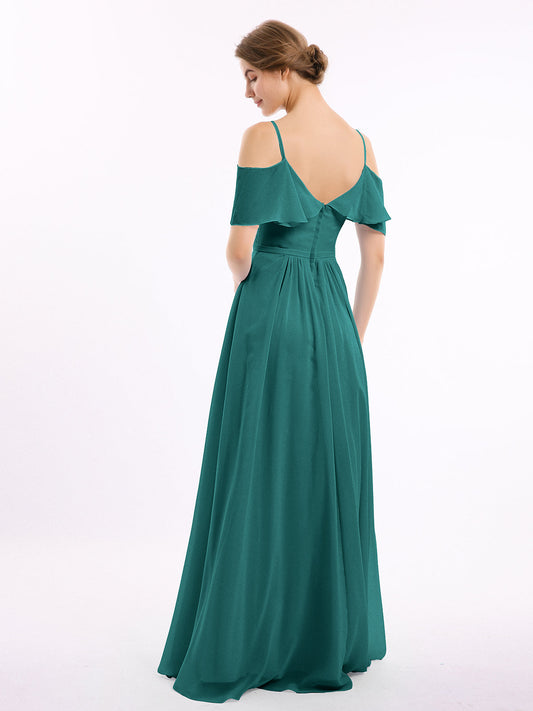 Babaroni RosaVestidos largos de dama de honor de chiffon con escote en Y y mangas de volantes Pavo real