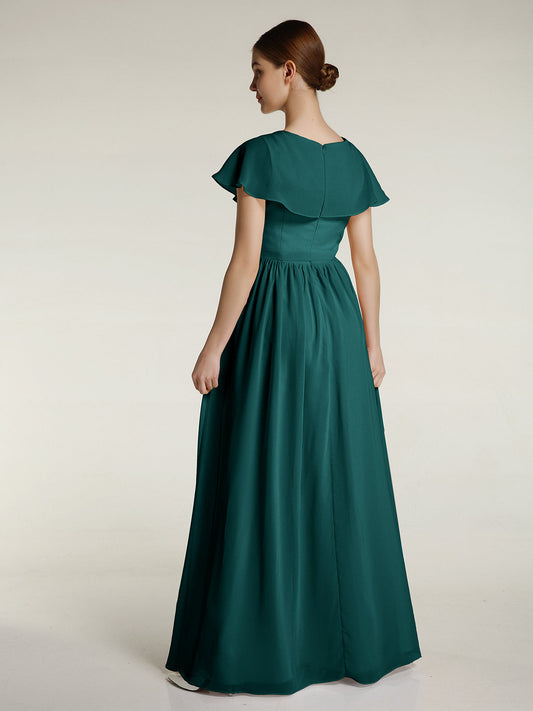 Babaroni MignonVestidos largos de dama de honor de chiffon con mangas de volantes Pavo real