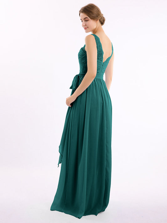 Babaroni LindaVestidos largos de chiffon con tirantes de encaje y lazo de cinturón Pavo real