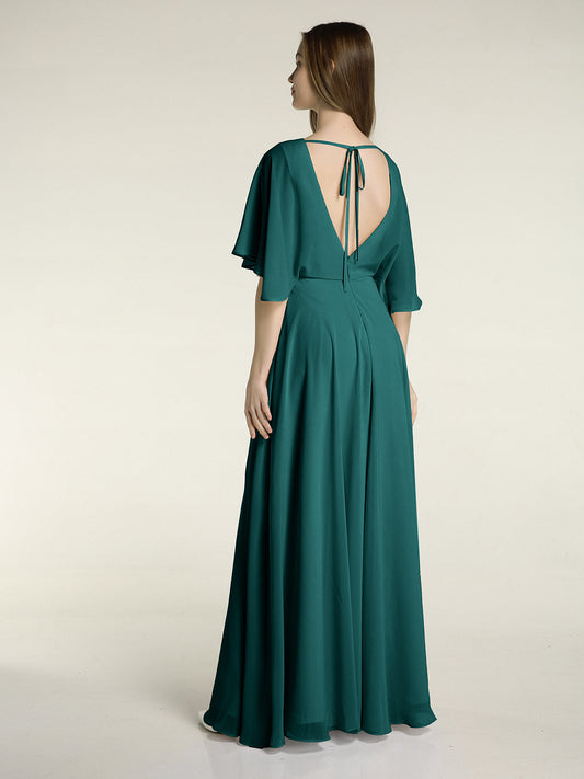 Babaroni GemmaVestidos largos de chiffon con mangas cap y abertura Pavo real
