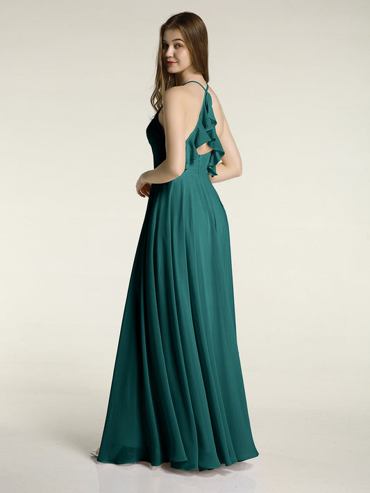 Babaroni AmyVestidos largos de dama de honor de chiffon con tirantes de cuello halter Pavo real