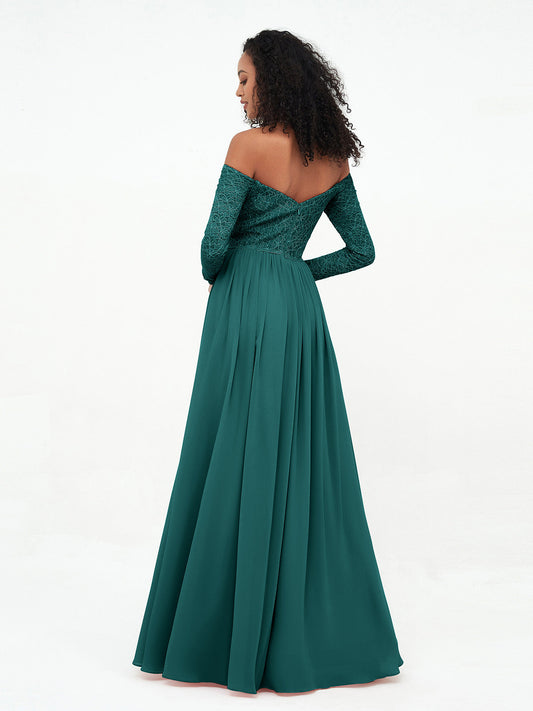 Babaroni JoannaVestidos largos de encaje con mangas largas y hombros descubiertos Pavo real